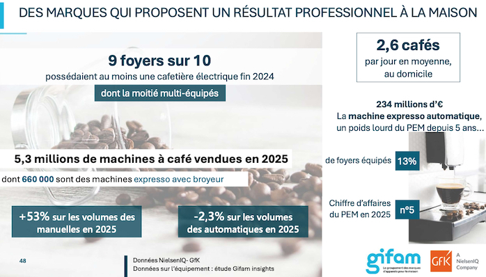9 foyers français sur 10 sont équipés d'au moins une machine à café. Bien qu'en baisse sur certaines familles comme les machines automatiques (-6%) et le café filtre (-5,8%), on note une hausse spectaculaire des machines expresso manuelles (+53%) et des bouilloires. Voici quelques-uns des chiffres du bilan de l'électroménager 2025, communiqués par le Gifam et NielsenIQ-GfK lors de la conférence de presse annuelle.